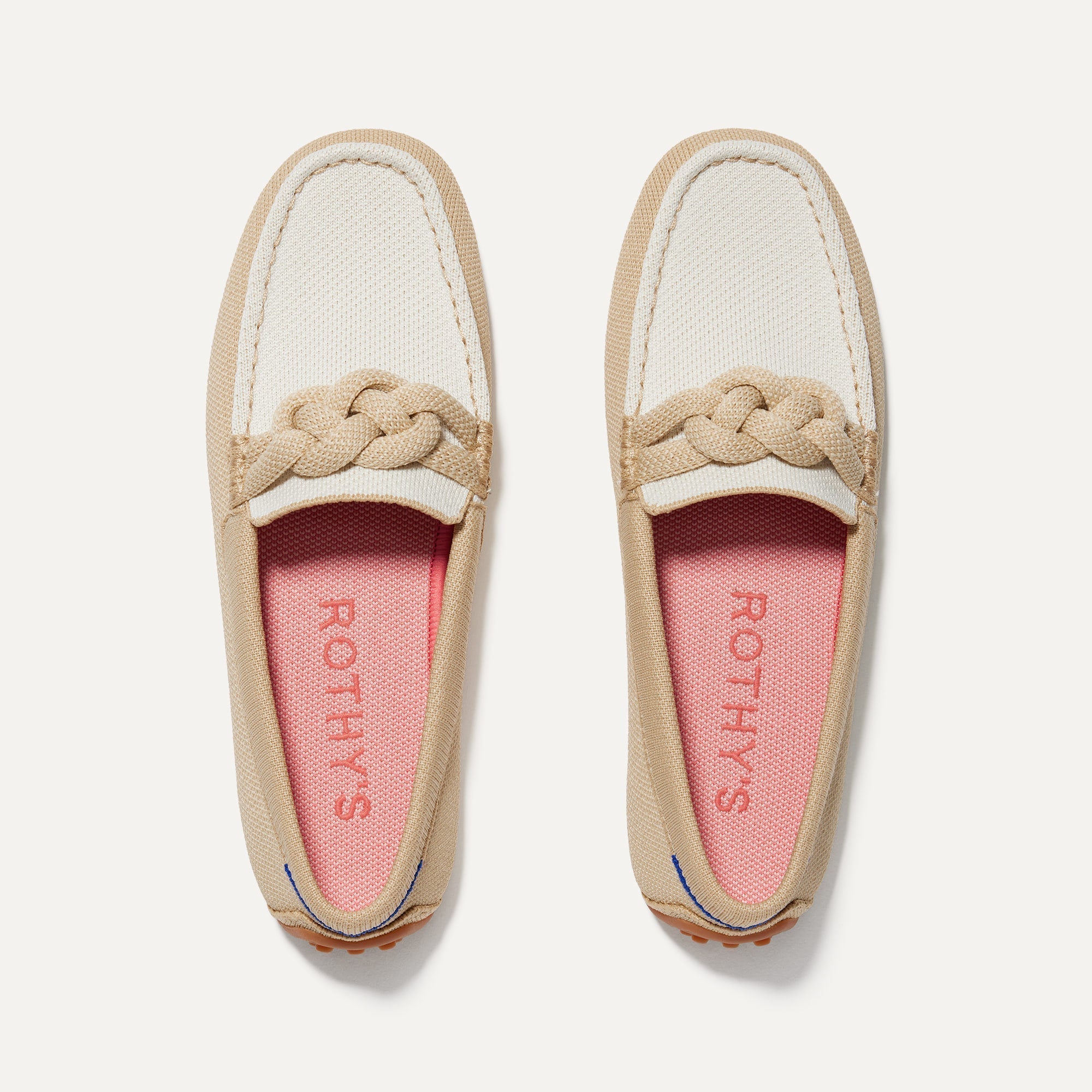 • Soft. flexible upper in tan and cream with a tan braid on the vamp.